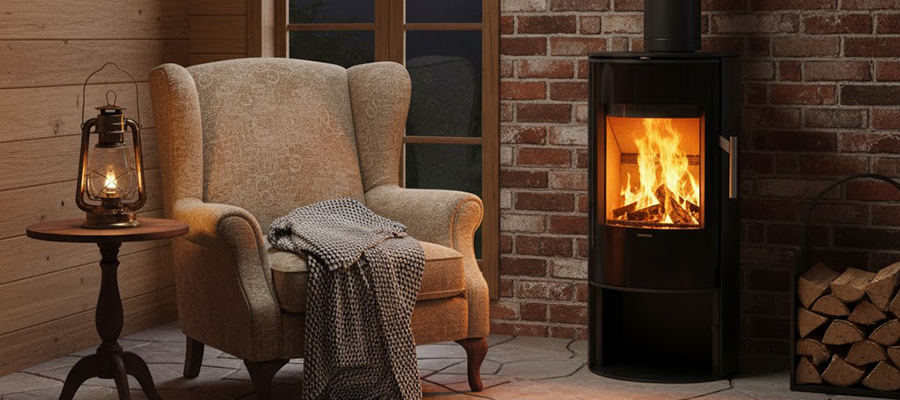 Der Ofen kann mit Holz und Holzbriketts beheizt werden und ist ideal für Wohnflächen von 45 bis 105 m² geeignet. Optional kann eine Tür für das Holzfach erworben werden.
